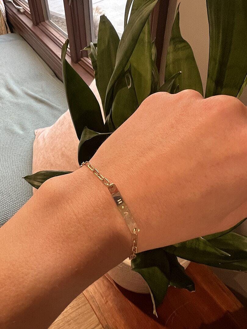 This gold-filled essential chain is accented with a gold tag that can be engraved. Wear it as an everyday piece and add up to 8 characters to make this bracelet more memorable.