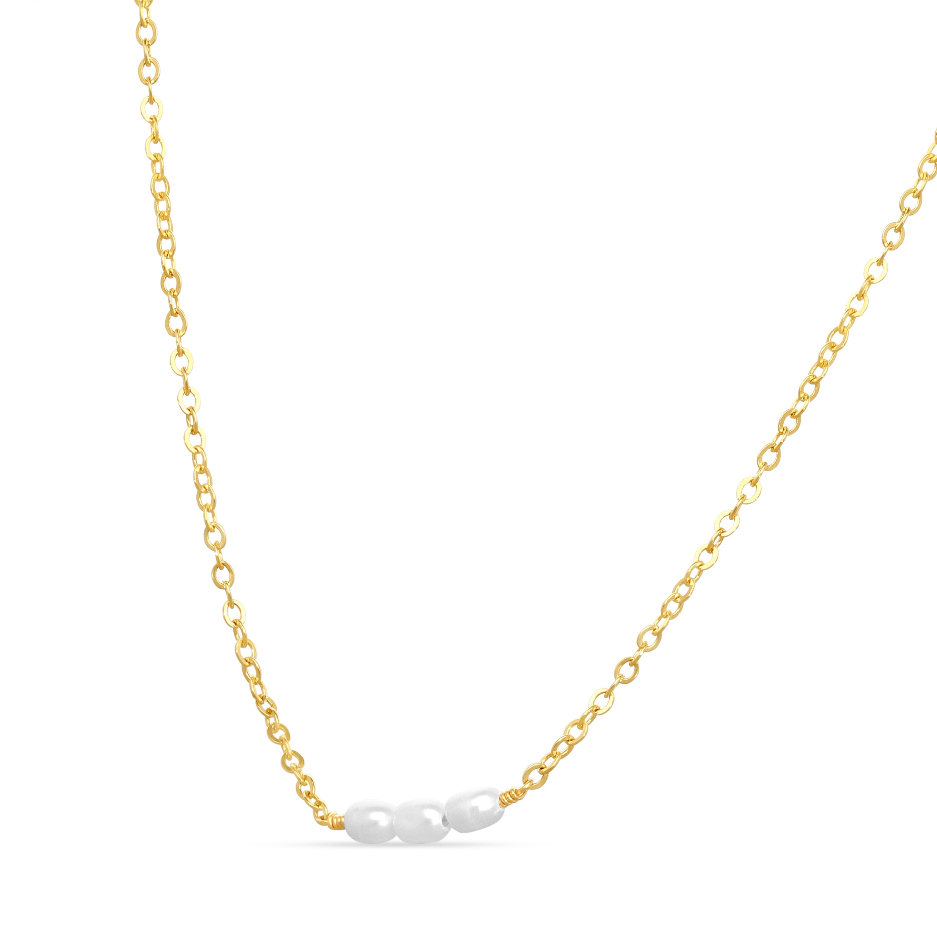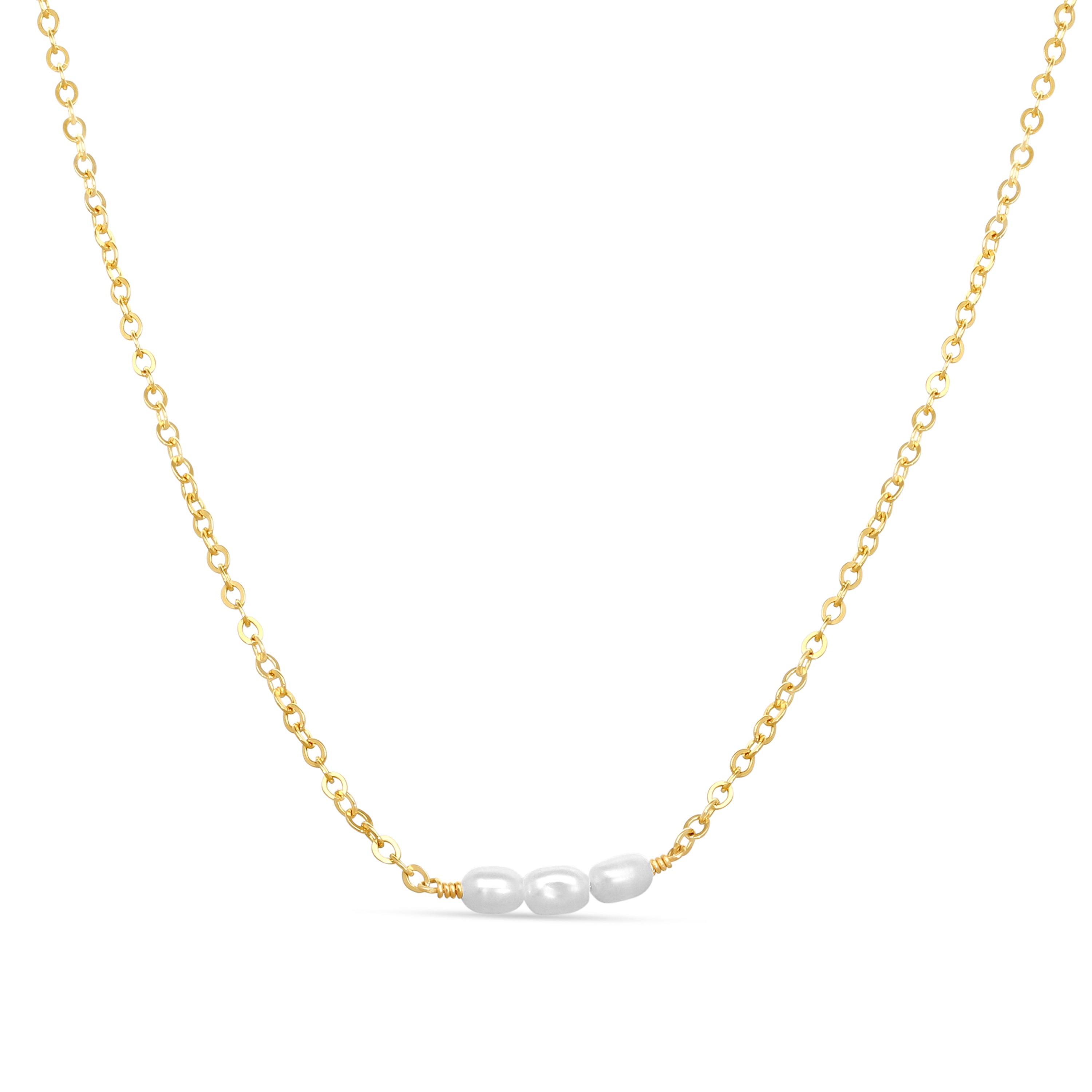 Minimal pearl, maximum polish. The Nola Pearl Lux Necklace features three luminous freshwater pearls aligned at center front on a refined 1.8mm gold-filled chain. The silhouette is softly modern — delicate enough for everyday, intentional enough to anchor a layered neckline.